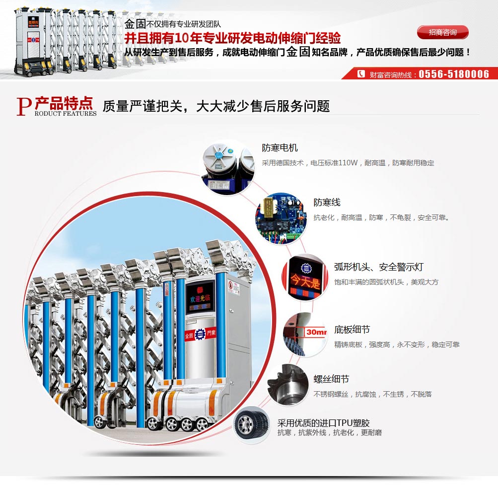 公司簡介 安慶市金固門業科技有限公司位于中國安徽省安慶市經濟技術開發區迎賓大道306號,旗下擁有“金固門業”和“勇創智能”兩大品牌,是一家集電動門、電動伸縮門、平移懸浮門、平移段滑門、分段門、感應門、道閘、停車場系統、值班崗亭、圍墻護欄、不銹鋼旗桿等產品的設計、生產、銷售及售后的專業化一體企業。公司具有多年的生產制造經驗,產品全面采用CAD計算機輔助設計,嚴格執行ISO9001質量體系標準進行生產管理。公司同時積極引進國內外先進技術,不斷創新。由于產品的設計合理、工藝先進、性能可靠及質量穩定,深受廣大用戶的信賴和好評,產品在市場消費者中享有較高的地...